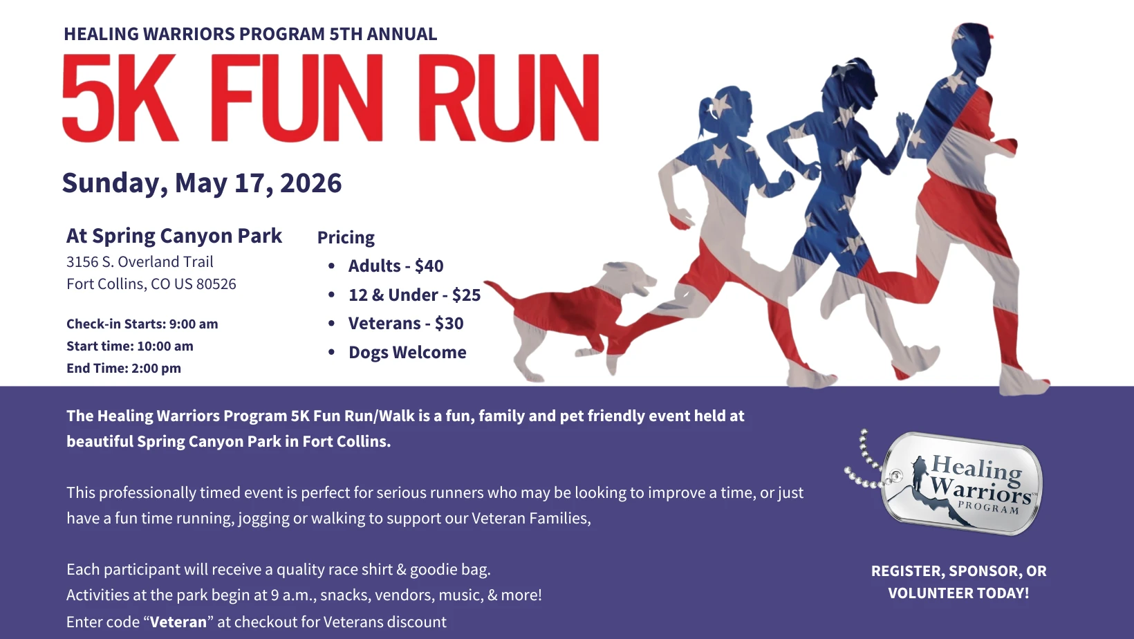 The Healing Warriors Program 5K Fun Run/Walk is a fun, family and pet-friendly event at the beautiful Spring Canyon Park in Fort Collins.
